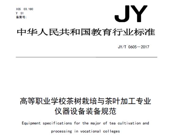 近日,从有关方面了解到,由我院茶叶专业参与制订的教育行业标准《高等职业学校茶树栽培与茶叶加工专业仪器设备装备规范》(JY/T 06052017)、《中等职业学校茶叶生产与加工专业仪器设备装备规范》(JY/T 06042017)、四川省地方标准《川红工夫红茶加工技术规程》(DB51/T 878—2017)先后通过中华人民共和国教育部、四川省质量技术监督局等相关部委发布实施。