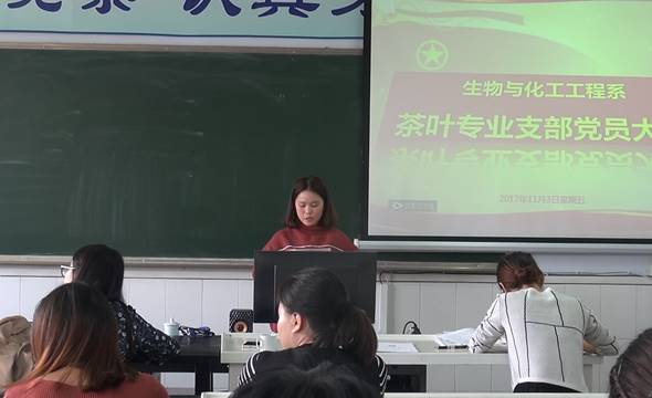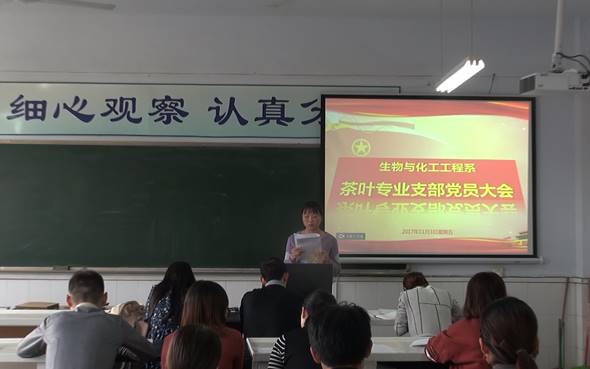 2017113日,茶叶专业支部在茶叶审评室召开支部大会,讨论吸收吴春霞等5位发展对象为预备党员及讨论彭丽媛等3位预备党员事宜。茶叶专业党支部共有党员9名,其中正式党员5名,预备党员4名,到会党员8名,其中正式党员4名(1名正式党员因公请假)、预备党员4名,符合召开支部大会的人数要求。