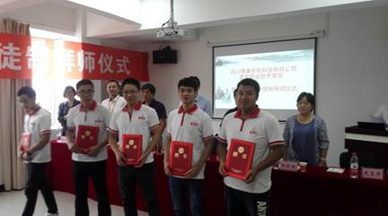 德康集团川南片区总经理熊太权、宜宾职业技术学院副院长张毅在仪式上做了重要讲话,双方领导并向德康集团带徒师傅代表杨伟、杨刚辉、陈润生、刘勇、胡彪颁发了师傅聘书。