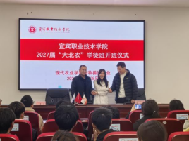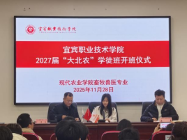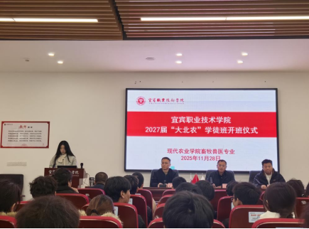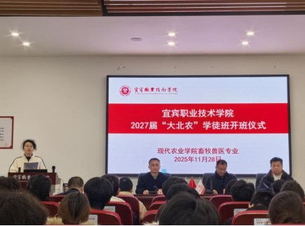 11月28日,宜宾职业技术学院2027届畜牧兽医专业现代学徒制大北农班开班暨拜师仪式在振兴园104成功举行。大北农集团四川区人力总监王兴平、繁殖生产经理吕凯等6位企业嘉宾,现代农业学院院长成洲、党总支书记刘永兴、畜牧兽医教研室党支部书记易宗容等教师代表,及全体大北农学徒制班学生齐聚一堂,共同开启校企协同育人新篇章。本次仪式由畜牧兽医专业教研室主任黄小燕主持。