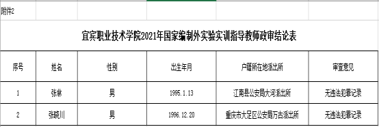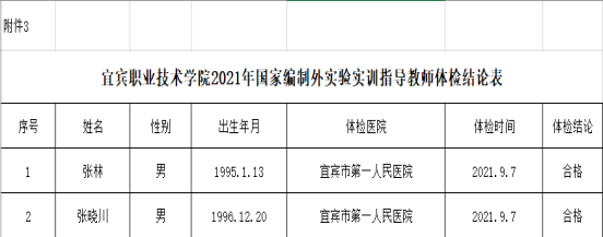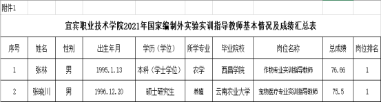根据《宜宾职业技术学院2021年国家编制外聘用实验实训指导教师招聘公告》的要求,于2021年8月27日对报名人员进行了面试和技能测试,张晓川、张林2人进入体检、政审环节。张晓川、张林2人体检、政审均合格,拟聘用张晓川、张林为校编实验实训指导教师,现将有关情况予以公示。公示期为2021年9月16日-9月21日。如有异议,请实名向宜宾职业技术学院现代农业学院反映。