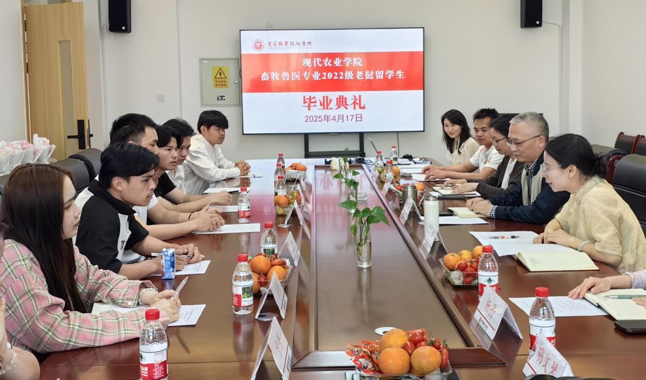 2025417日,2022级畜牧兽医专业老挝留学毕业典礼在振兴园210会议室举行。出席会议的有现代农业学院党总支书记刘永兴、党总支副书记李丹、辅导员李剑、畜牧兽医教研室教师黄小燕、王晶、杨丹、对外汉语教师胡文琴、王杰以及72022级老挝国际班学生,典礼由李丹主持。